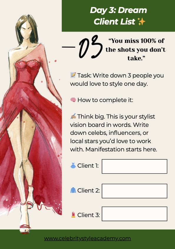 You’ll write down three people you’d love to style one day, helping you get crystal clear on your vision and future. It’s more than a worksheet—it’s your first step into the world of professional styling.