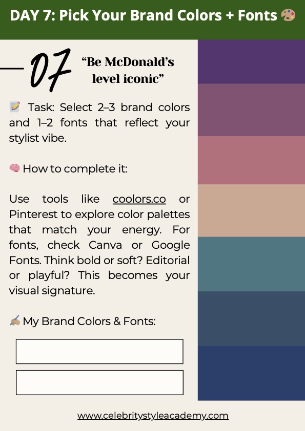 In Day 7, you’ll lock in your visual identity by choosing 2–3 brand colors and 1–2 fonts that reflect your vibe as a stylist. This becomes the foundation of your portfolio, social media, and pitch decks. Because to get booked, you need to be recognizable—even before you say a word.